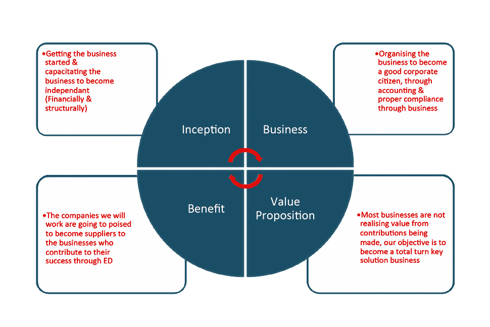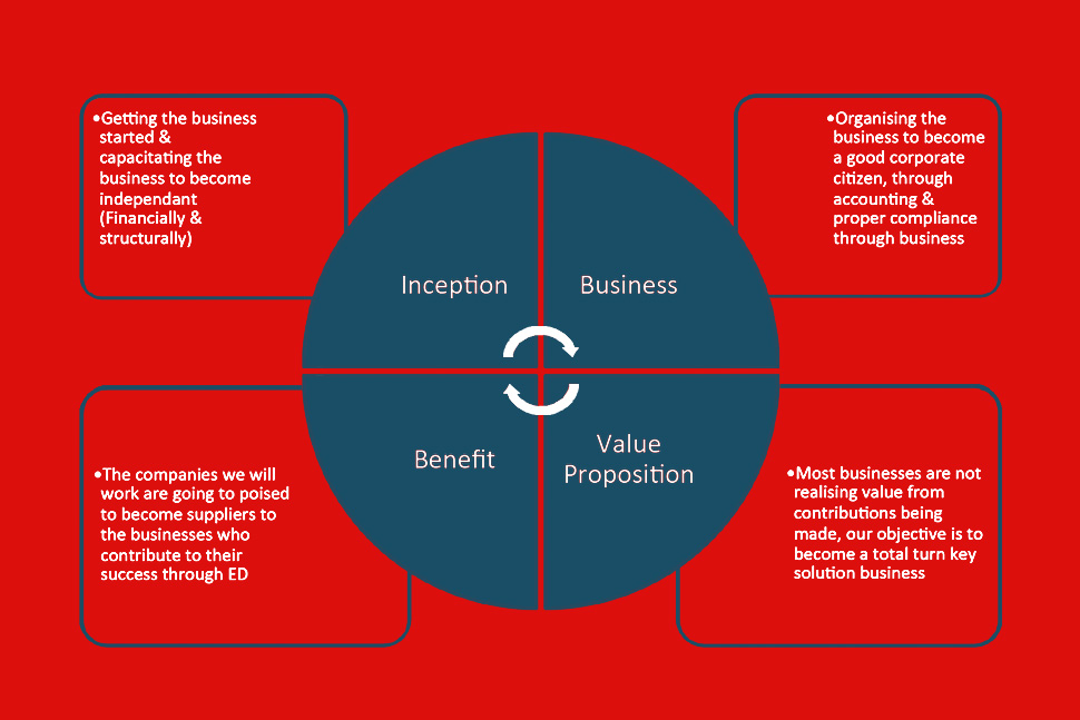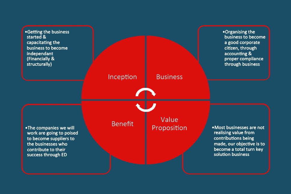 Our primary focus is to engage with businesses who would like to assist small emerging businesses to become financially independent and furthermore become suppliers to these businesses, both fulfilling Enterprise & Supplier Development prescripts as set out by the Department of Trade and Industry. We do not have a specific sector in which we operate thus making our services versatile.